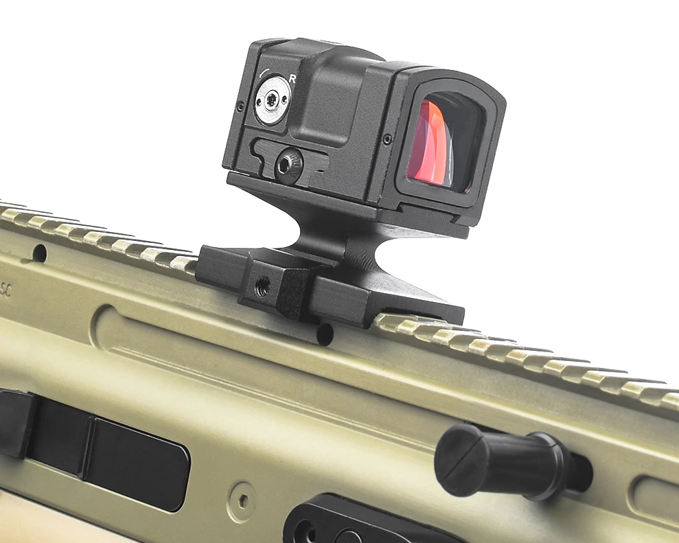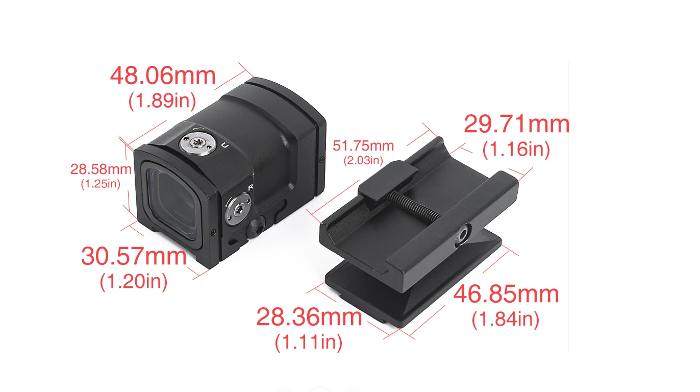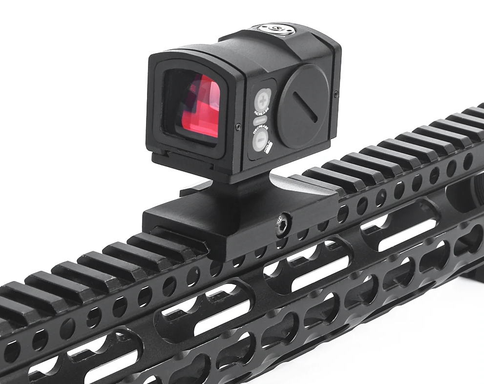 Red dot sight from Aim-O. Adjustable brightness red dot reticule, powered by 1x CR2032 battery (not included). Includes 20mm 1.54" high mount and pistol mount plate (modification to pistol required).