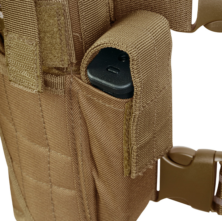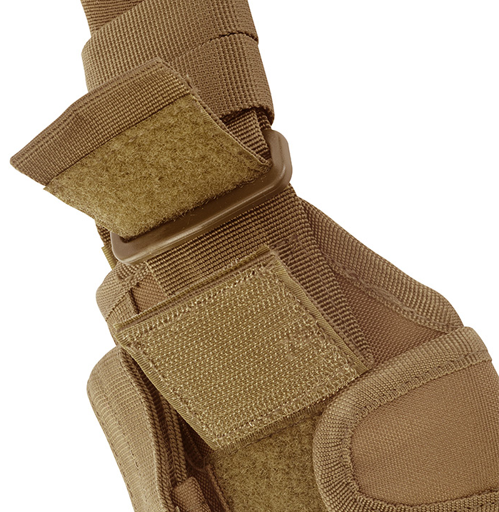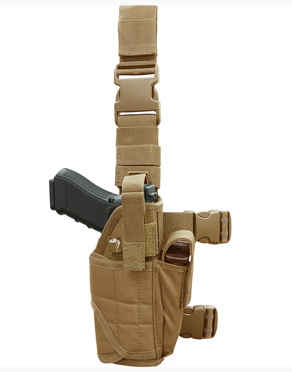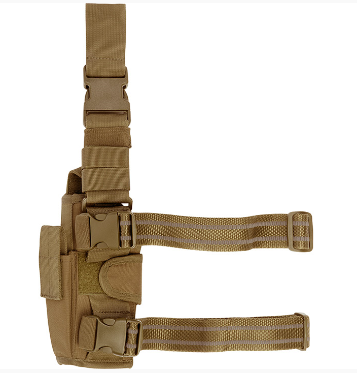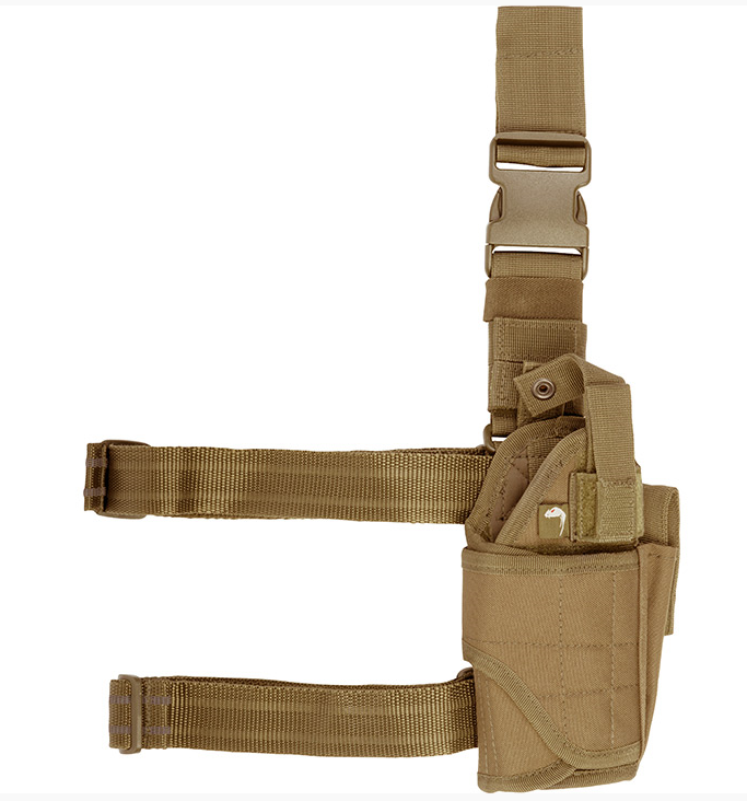Using a leg holster to carry your sidearm is both practical and comfortable. The Viper Tactical Adjustable Holster is packed with features allowing you to fully customise it to your needs. Using hook and look adjustable straps on top and inside the holster you can adapt it to fit most of the popular pistol brands. The holster can be fitted using two adjustable wraparound leg straps and a belt strap with quick release buckle and hook and loop size adjustment. If needed the belt strap can be removed. On the front of the holster we added a pouch that can be used to carry one additional pistol magazine or small utilities including lightsticks or a small torch. The pouch height can be adjusted using the removable hook and loop closure. The Viper Tactical Adjustable Holster is perfect for military enthusiasts, army and police forces as well as airsoft and paintball players.