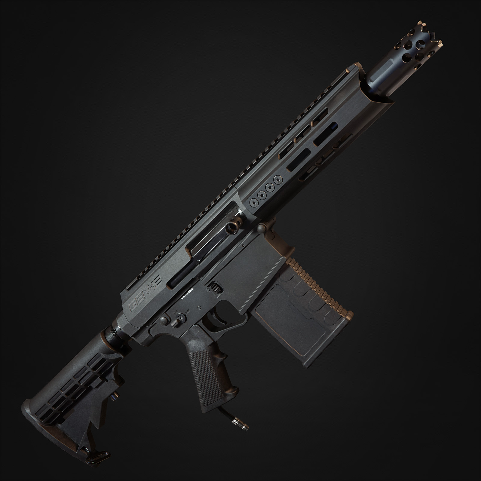 The Gen-12 MTW SBS Shotgun is delivers full-size shotgun power in a compact, CQB-ready profile for aggressive, fast-moving players who want overwhelming firepower in confined spaces. The SBS features a licensed Genesis Arms black-oxide anodized upper receiver with right-side charging handle and a redesigned lower receiver compatible with PDW stocks, as well as a matching shorter 7″ Invictus M-Lok rail.