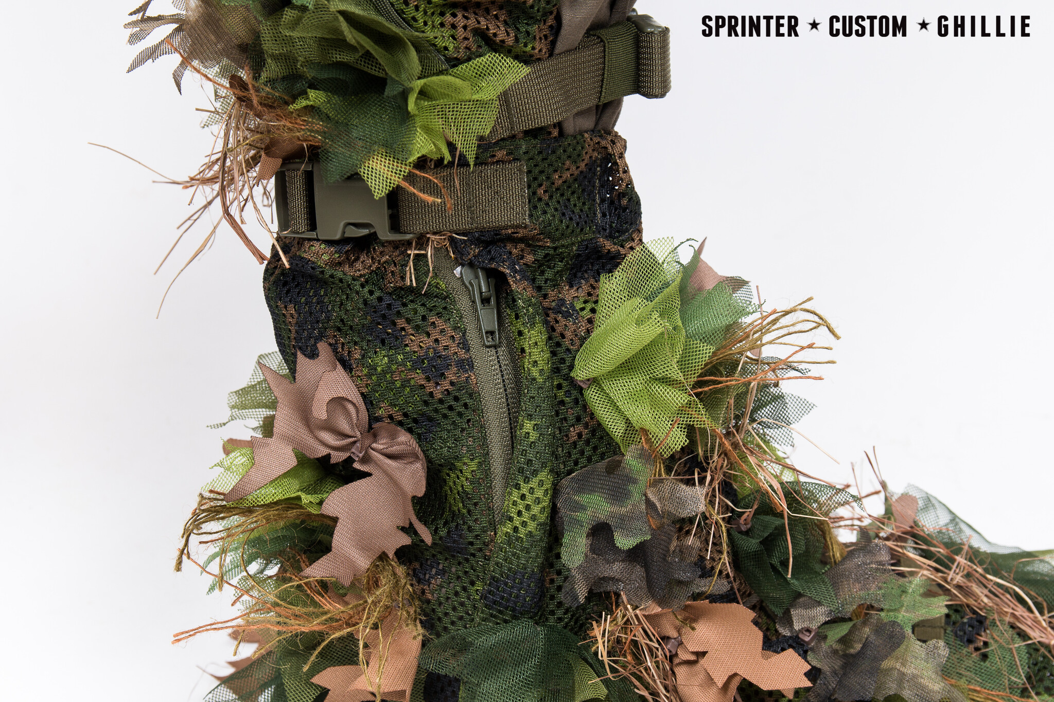 All components of the suit are covered with 3D elements and vegetation mounts. Additionally, a paracord grid is sewn onto the surface of the entire suit, enabling the quick application of additional 3D elements and vegetation mounts.
