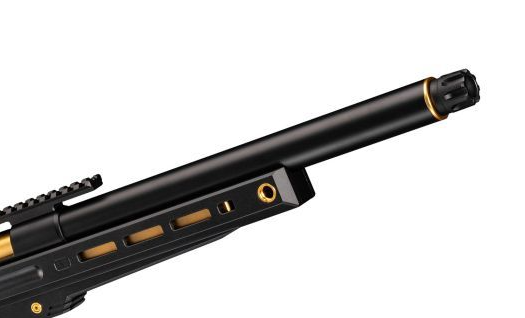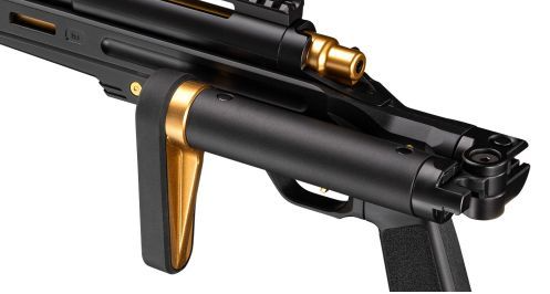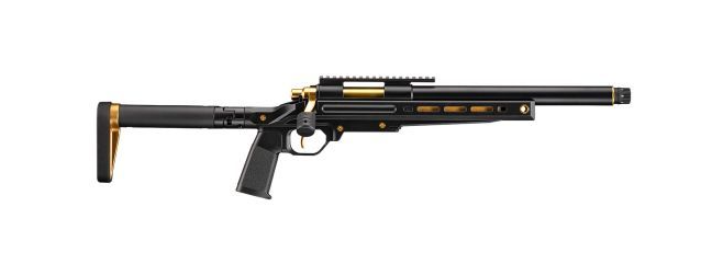 Gold parts are used in various places such as the muzzle, bolt, trigger, and stock, creating a striking contrast with the black body.